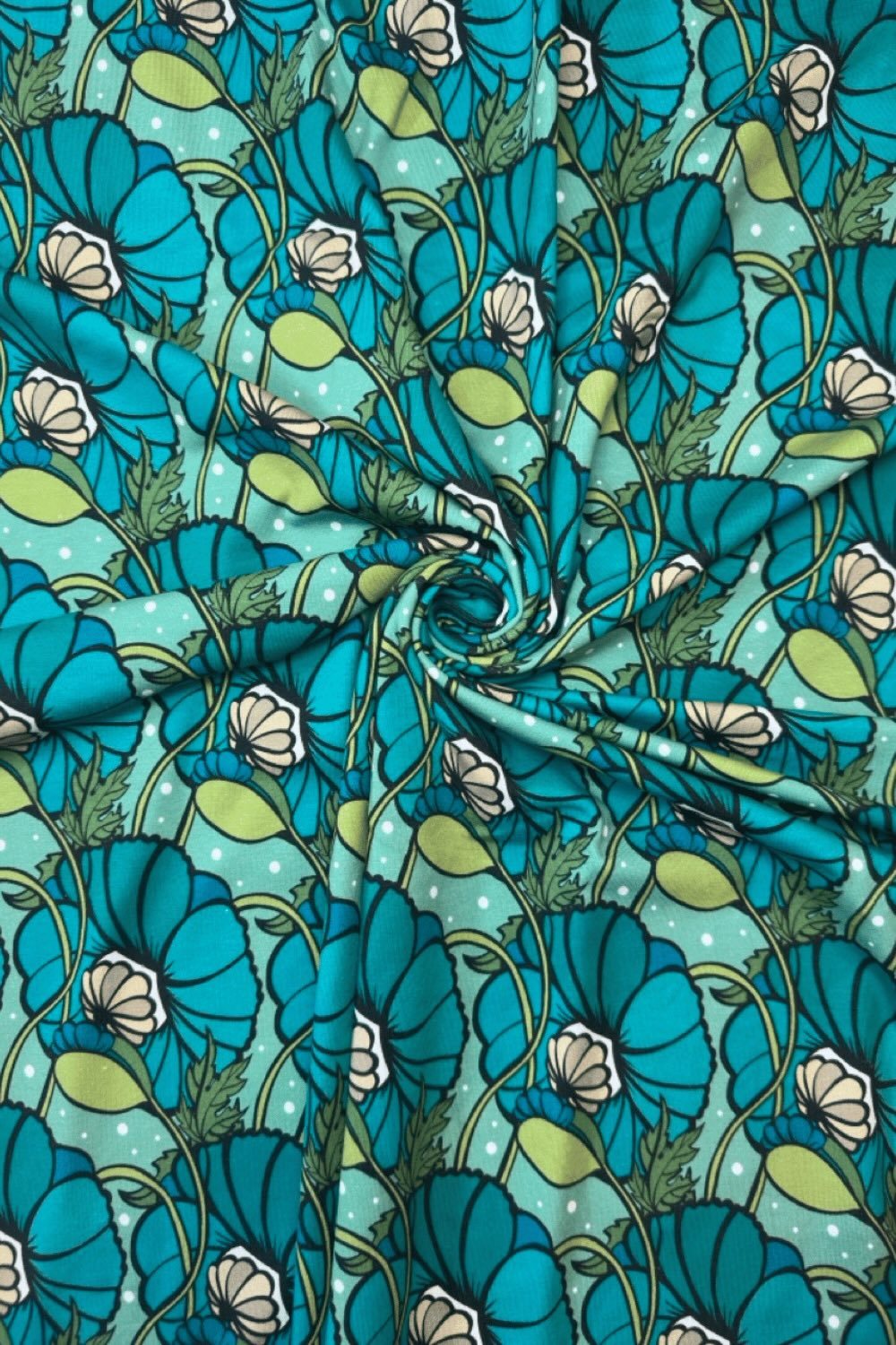 Organic jersey fabric Kronblad turkos - Teal flower print