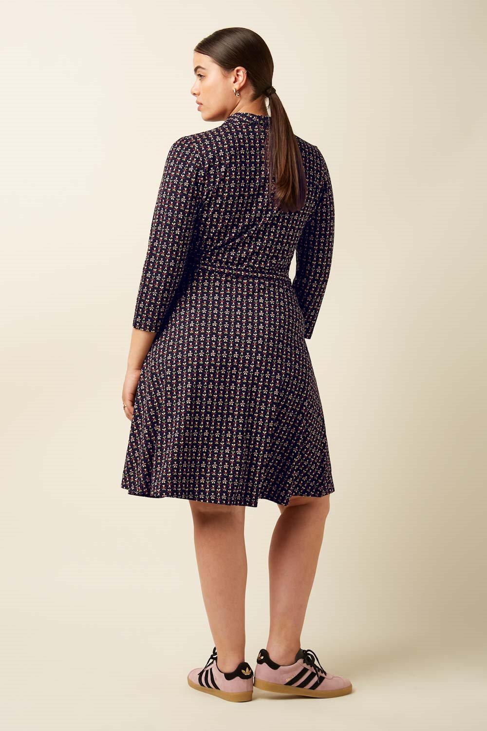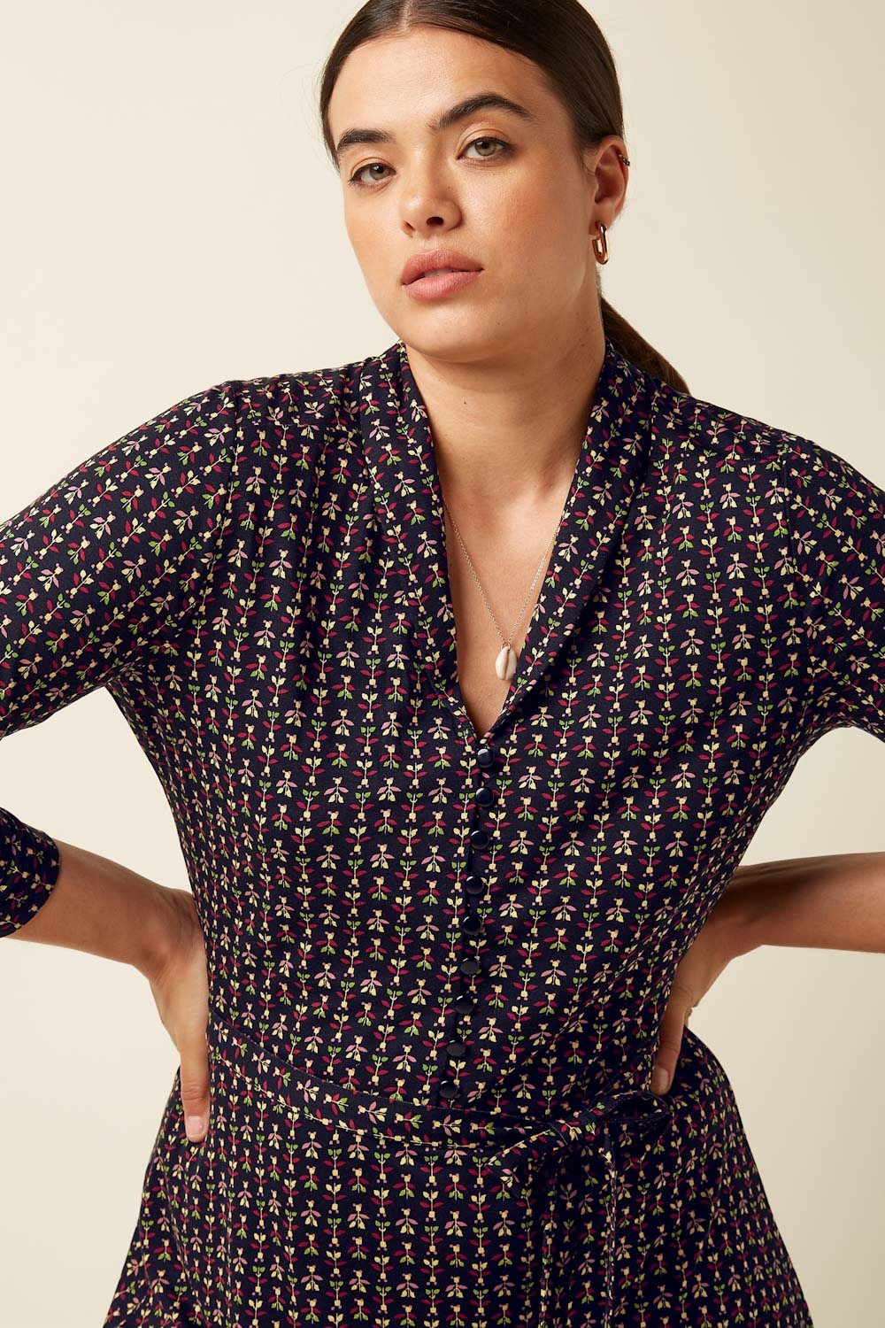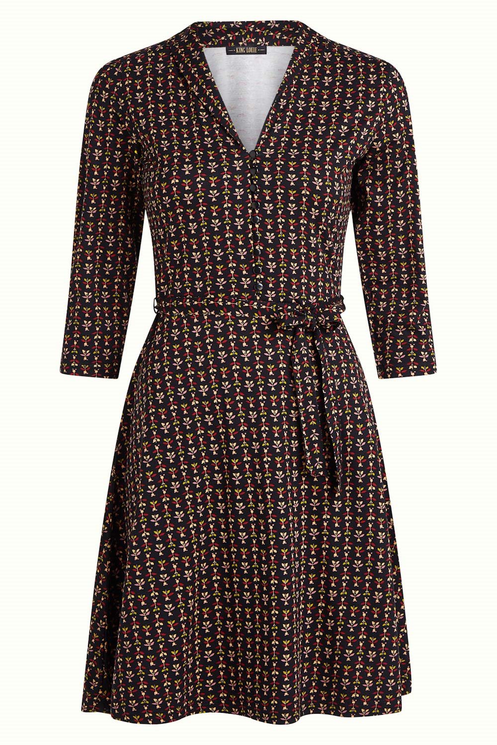 Model Emmy from the Dutch brand King Louie. This comfortable dress in viscose jersey features a lovely collar, buttoning down to the waist, and a gently flared skirt. A matching fabric belt is included to tie at the waist.