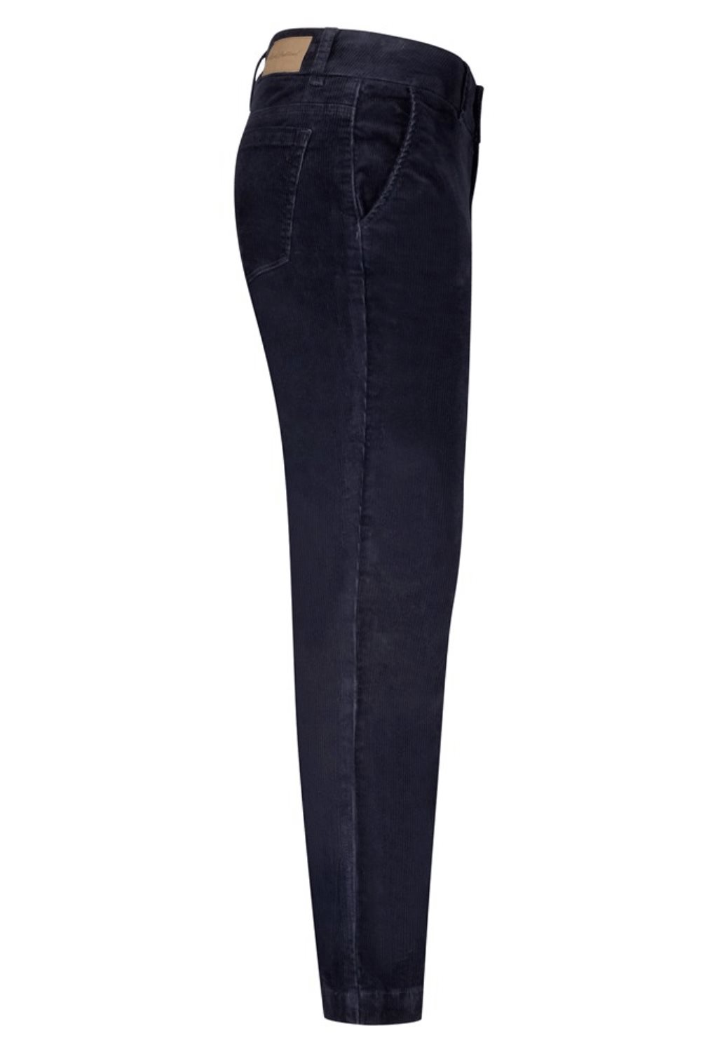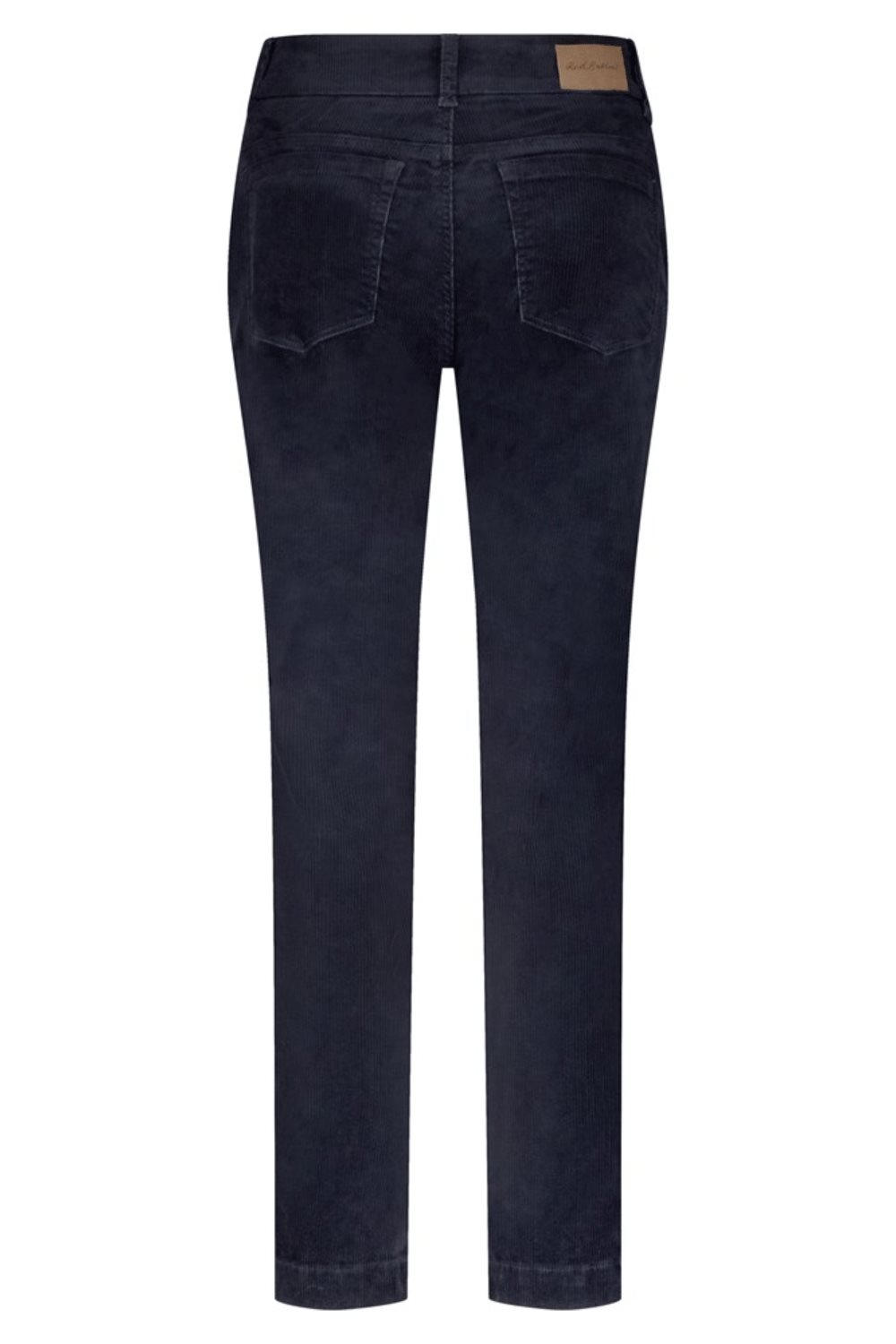 A pair of stretchy corduroy trousers from the brand Red Button. The trousers are slightly lower in the waist and fasten at the front with a zipper and two buttons. The trousers have two pockets in the front and two in the back. The legs are straight and slightly tapered at the bottom.