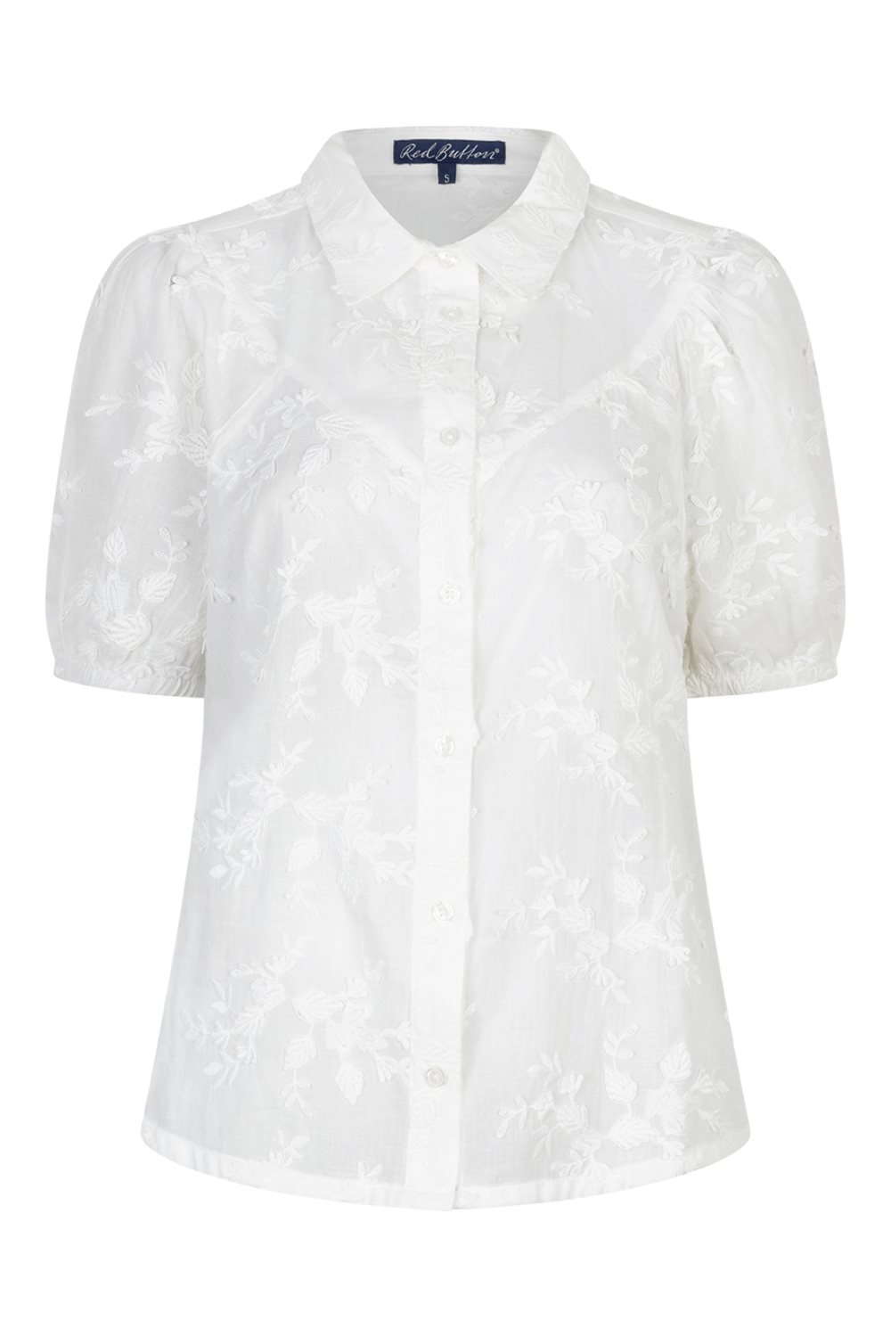 White blouse in lightweight cotton poplin with embroidered flowers, white buttons, and short puff sleeves finished with a small elastic cuff.