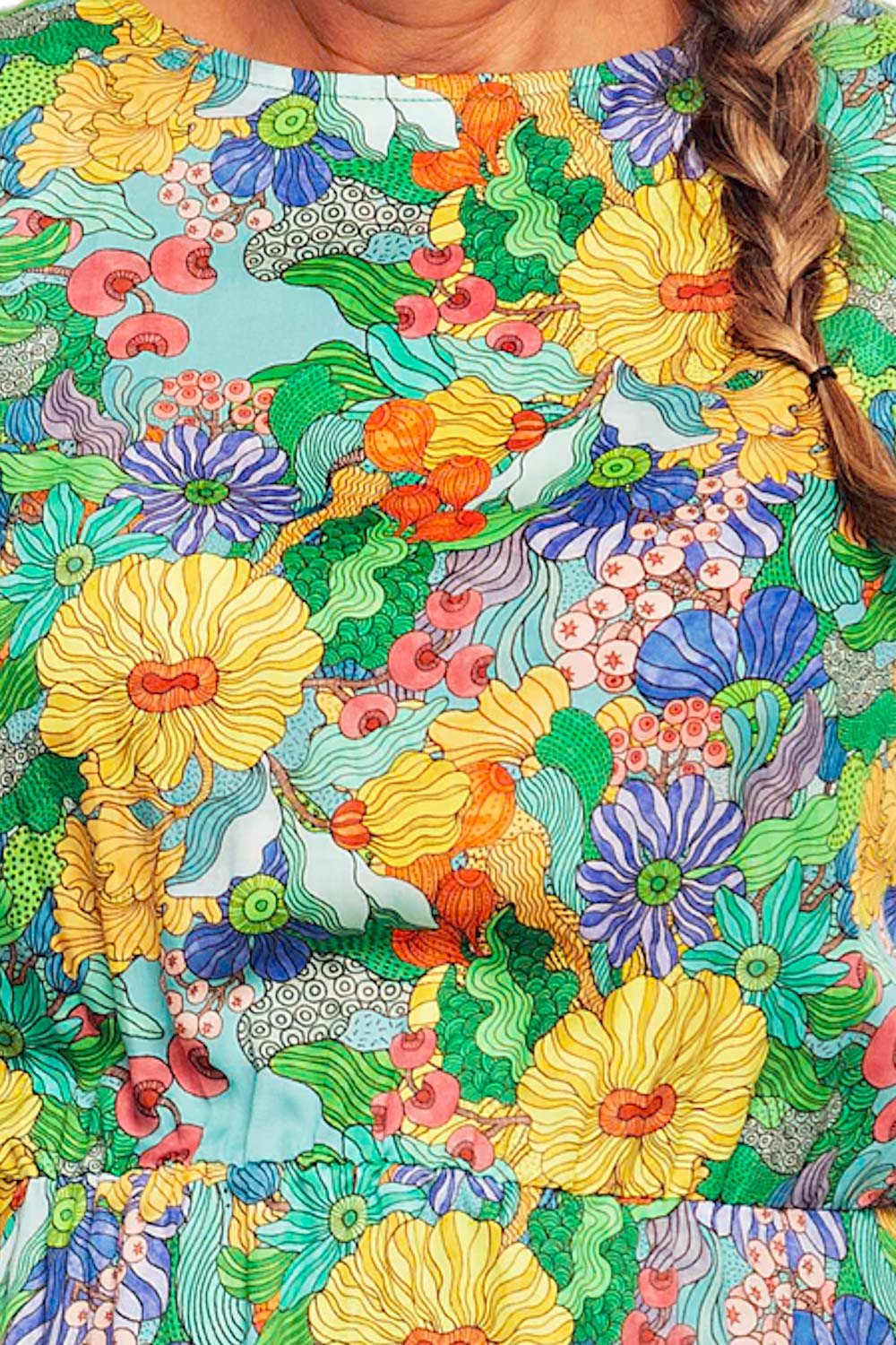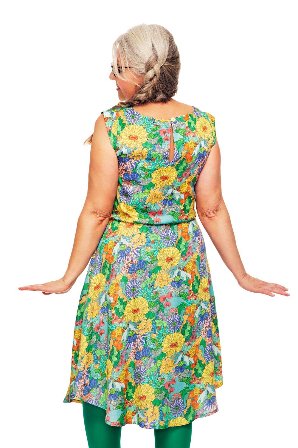 Malin is a beautiful, sleeveless dress made from comfortable, cool lyocell fabric. The dress features an elastic waistband, hidden side pockets, and a button closure at the back. The skirt has a curved hem, making it longer at the front and back and slightly shorter at the sides.