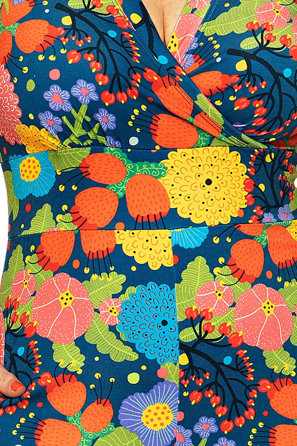 Britta är en snygg och skön byxdress i stretchig bomullstrikå. Modellen är v-ringad med omlotteffekt, med markerad midja och korta ärmar. Byxbenen är vida och ankellånga och självklart finns det fickor! Eftersom tyget har stretch är det enkelt att kliva i och ur byxdressen - inga knappar eller dragkedja behövs!