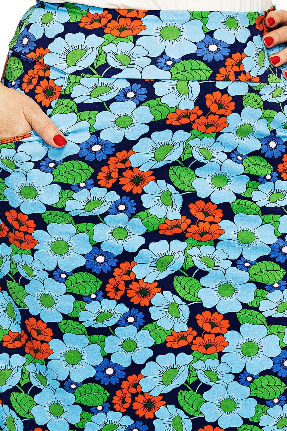 Tyget heter Humlesurr Blå. Det här är Cissi och Selmas klassiska blommönster som återkommer varje säsong i olika färgställningar, här i varianten i blått, orange och grönt.