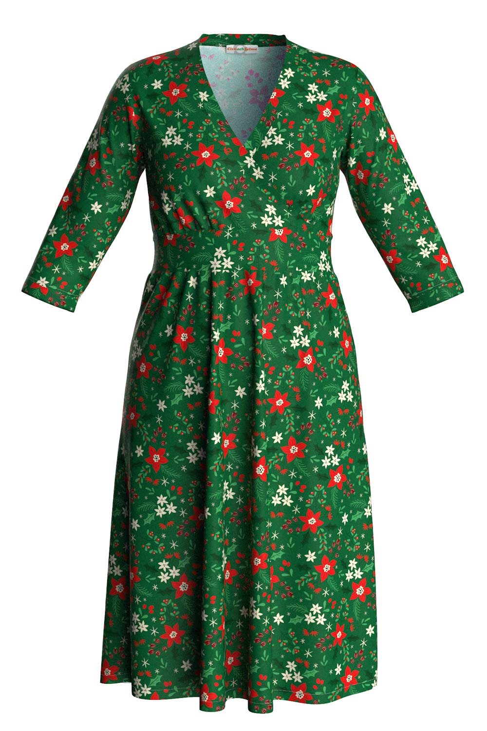 Vera är en härlig modell i mjuk och skön ekologisk bomullstrikå med fina detaljer. Den har V-formad omlottringning, ett markerat midjeparti och lätt rynkad kjol med fickor i sidorna. Knälång med trekvartsärm.