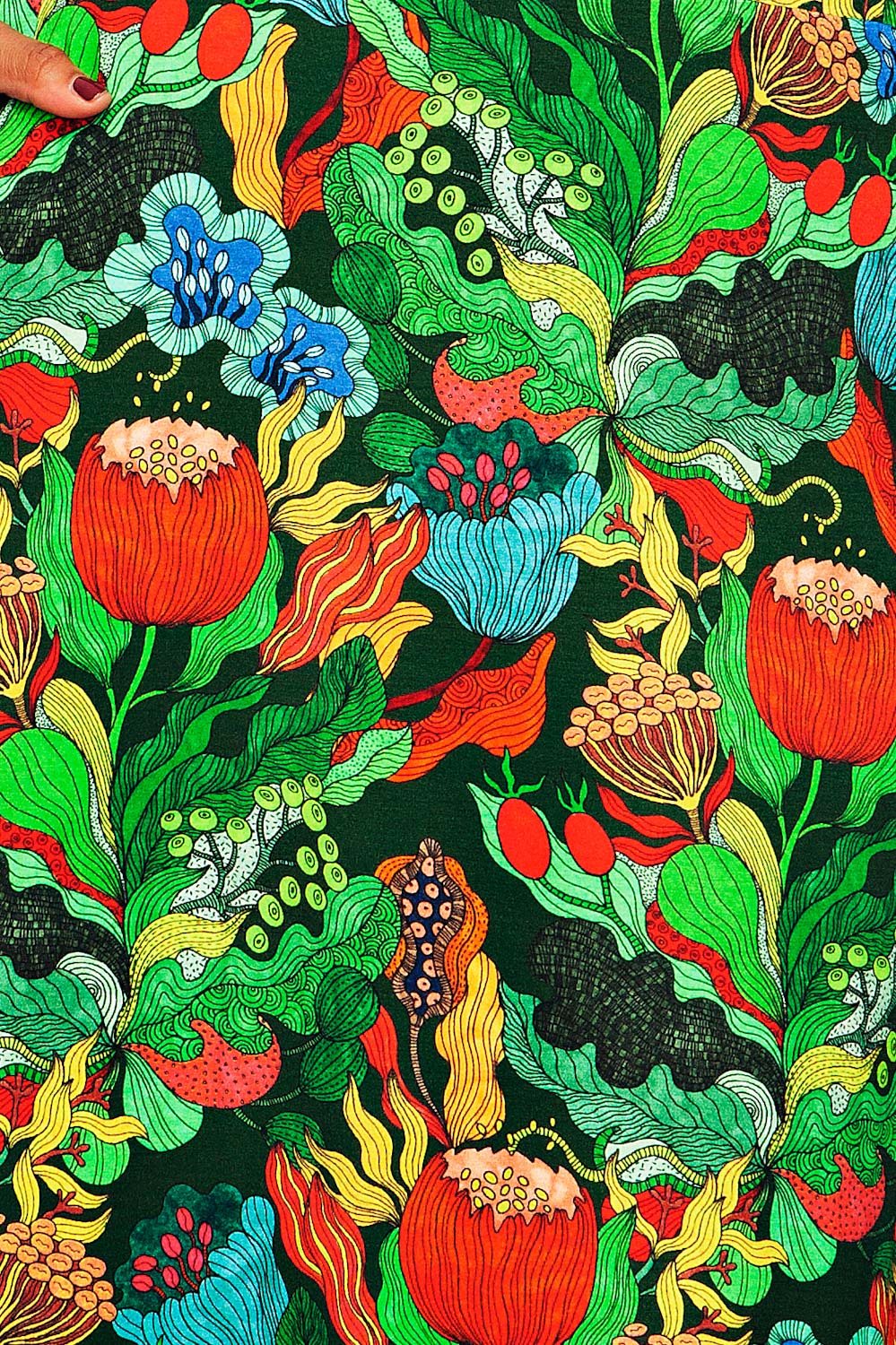Tyget heter Babylon grön, ett organiskt böljande mönster i täta slingor med blad och blommor, här och var dyker också några nypon upp. Färgerna skiftar i många olika färger bl.a grön, blå, rosa, gul orange, röd och turkos. Mönstret är designat av Framiadesign.