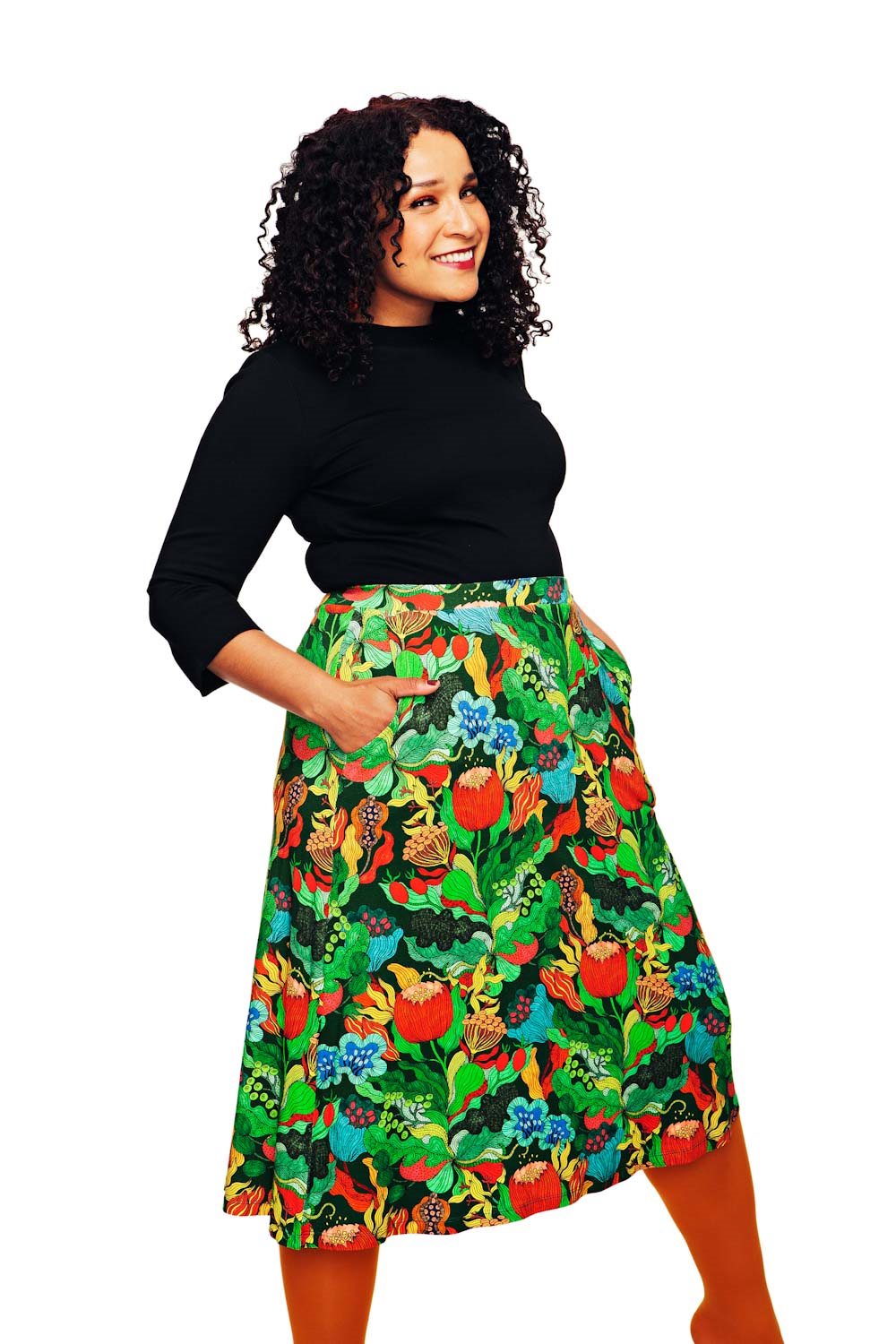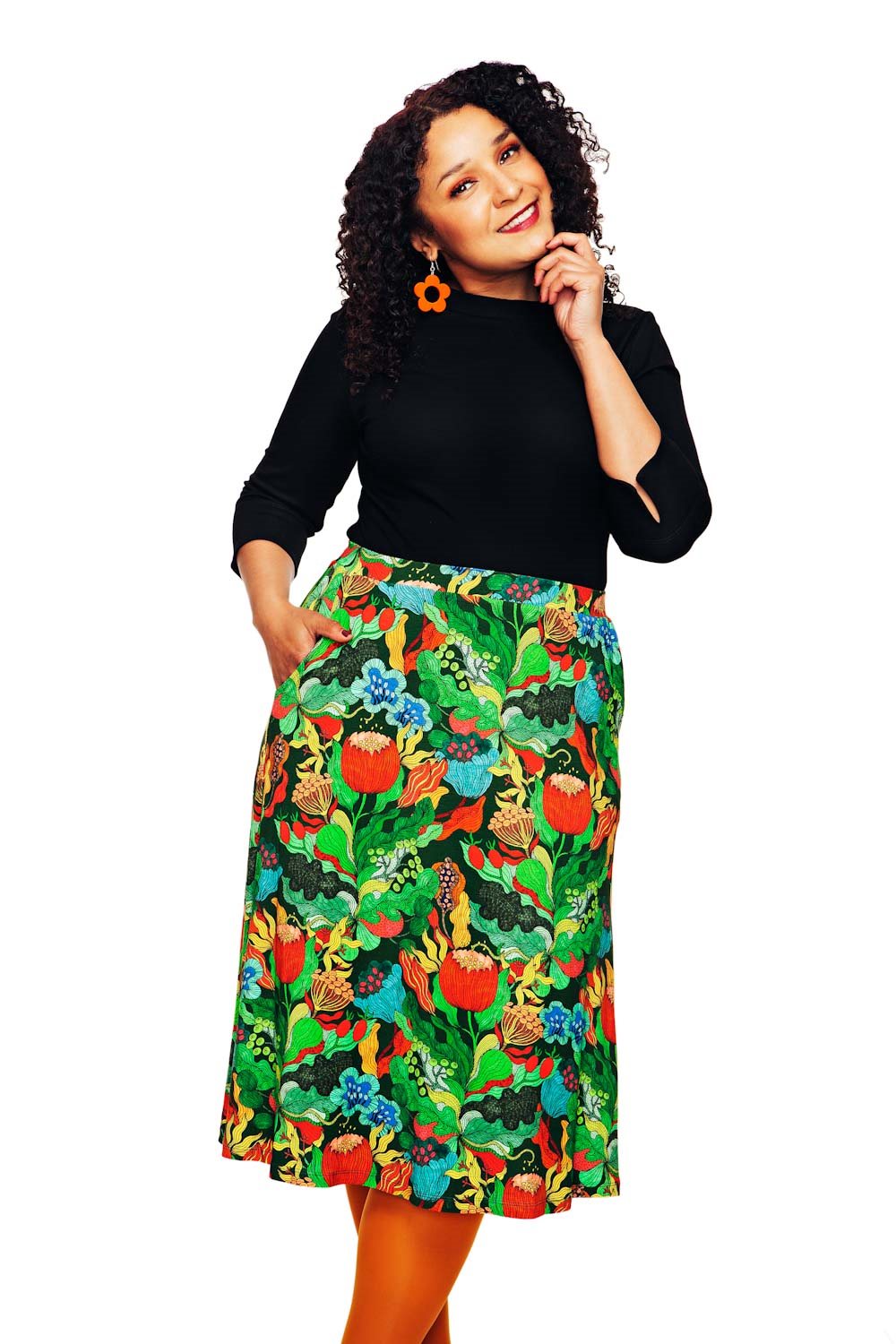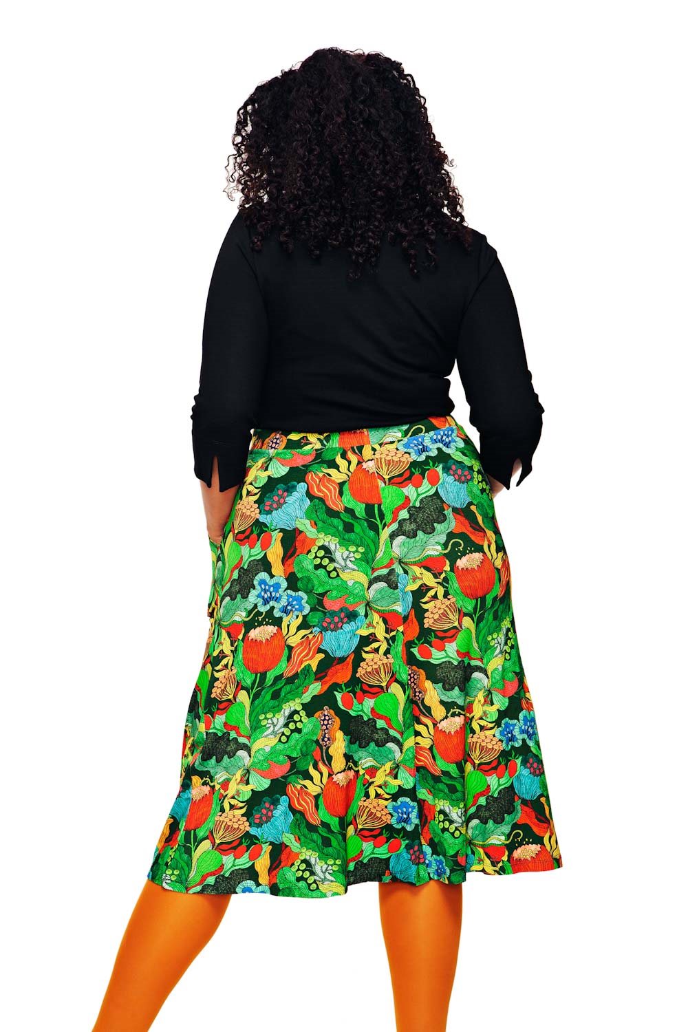 Lisa är en mjuk kjol i stretchig viskostrikå. Kjolen har fickor, resår i midjan och längden är till strax under knät. En lätt utställd passform gör att den är både elegant och bekväm.