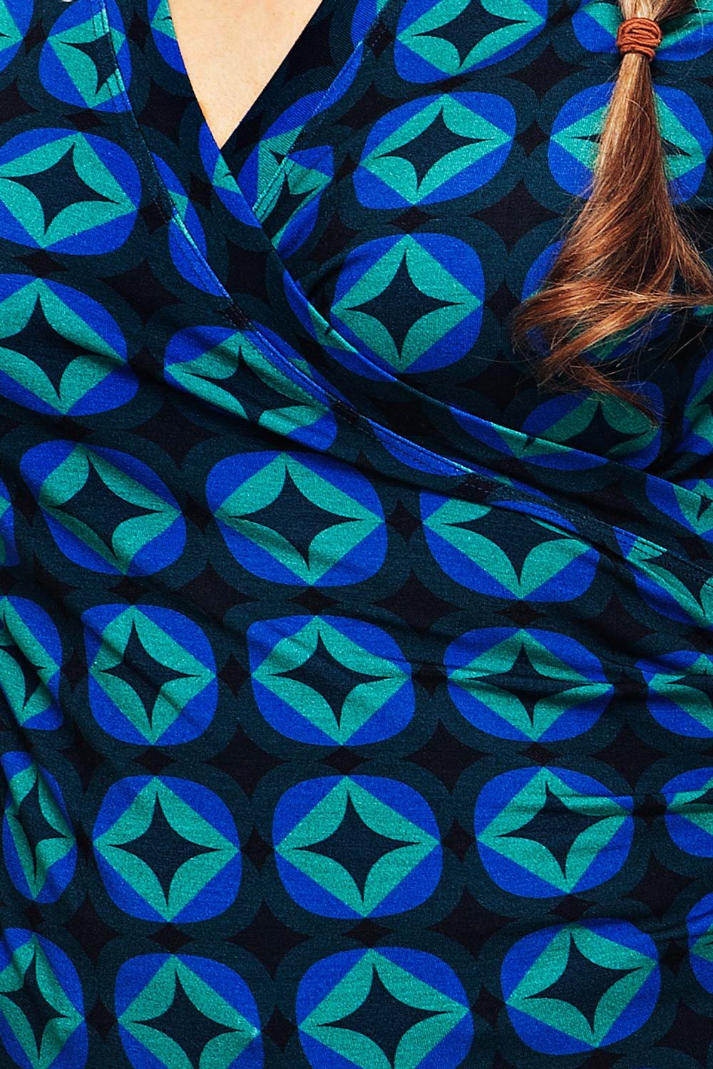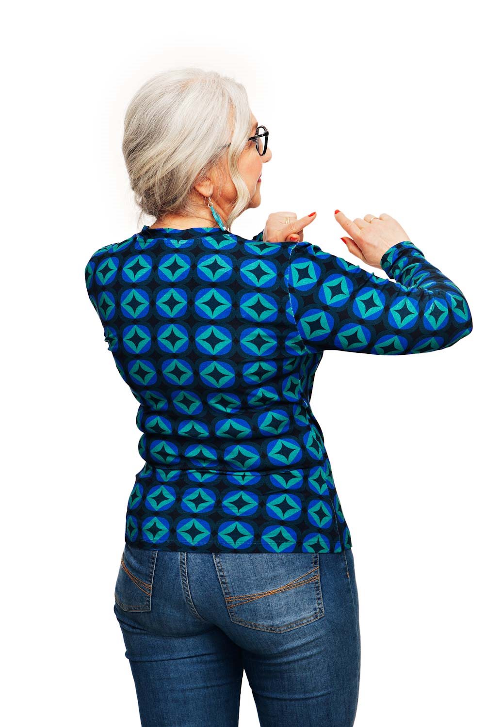 Tyget heter Mosaik Blå. Ett kalejdoskops-inspirerat mönster som går ton i ton i blå-gröna toner med svarta detaljer.