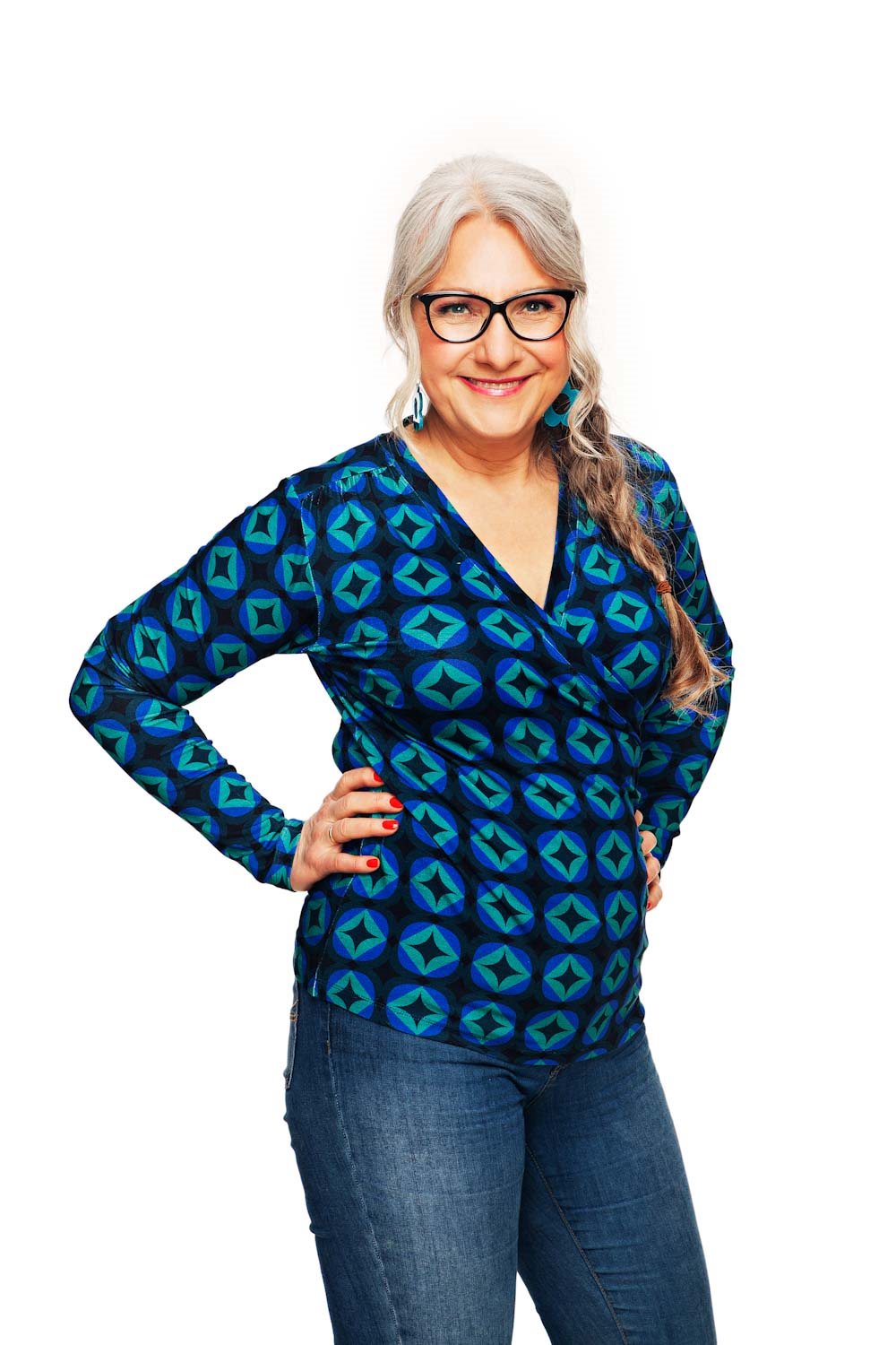 Vår topp Susanne i mjuk viskostrikå har en smickrande passform och är enkel att styla. Modellen är v-ringad med omlott-effekt och lång ärm.
