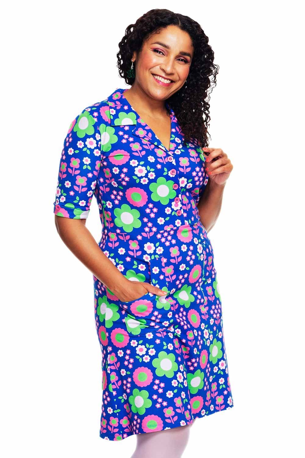 Tyget heter Daisy blå och har en blå bakgrund med blommor i olika storlekar i färgerna rosa, grön och vit. Det är ett mjukt och stretchigt tyg i trikå som passar att sy klänningar, toppar, barnkläder mm.