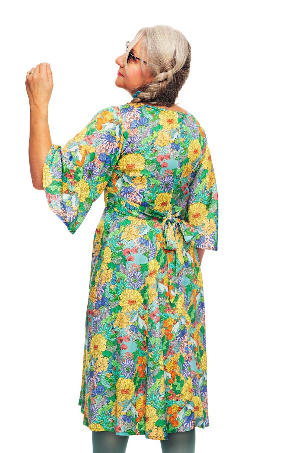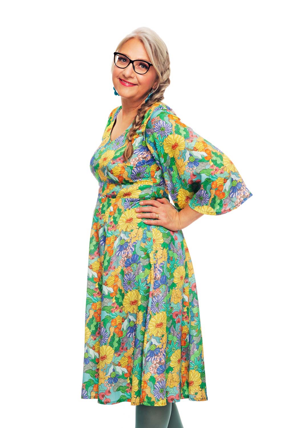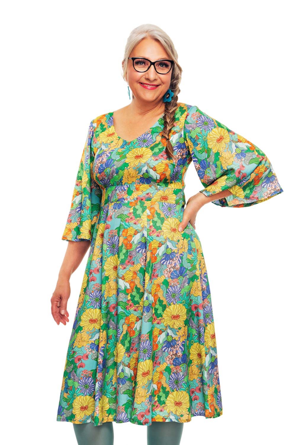 Gullan är en elegant och klassisk klänningsmodell i Lyocell med trumpetärm i 70-talsanda. Klänningen har en vacker v-formad ringning, en skärning under bysten med knytband bak i ryggen. Kjolen har ett fint fall och vidd. En bekväm festklänning eller vardagsklänning att bo i hela sommaren.