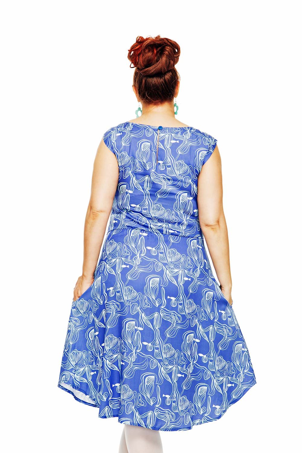 Malin är en fin, ärmlös klänning i skönt, svalt lyocell material. Klänningen har resår i midjan samt dolda fickor i sidan och en knapp i ryggen. Kjolen på klänningen är bågformad vilket gör att den är längre fram och bak men något kortare i sidorna.