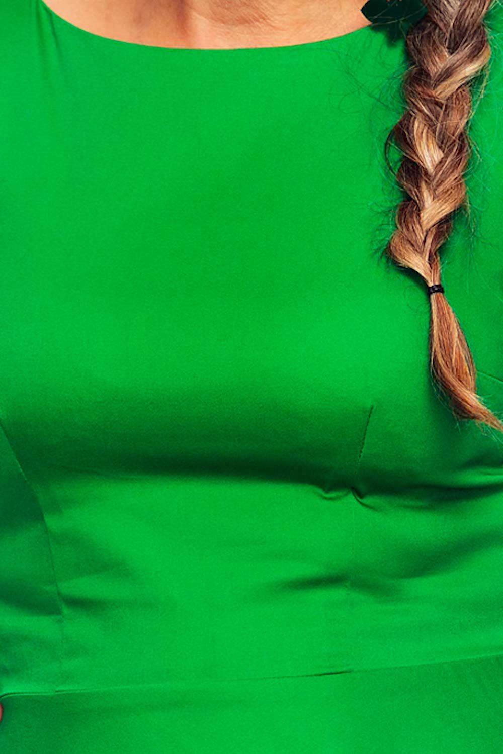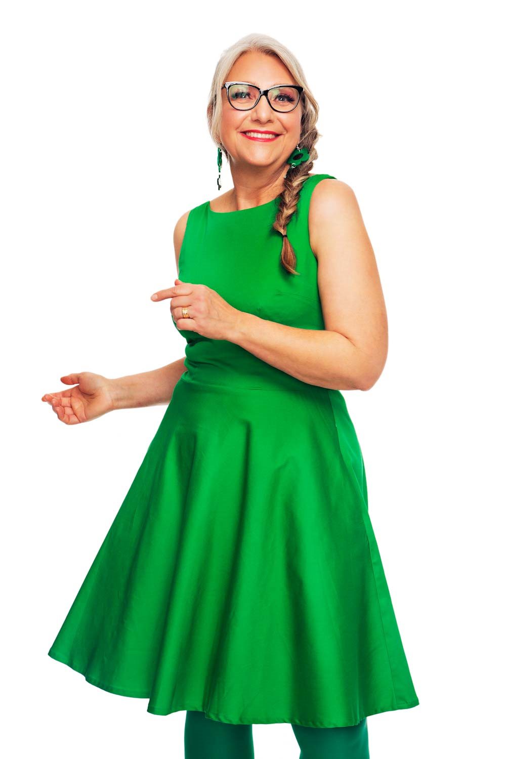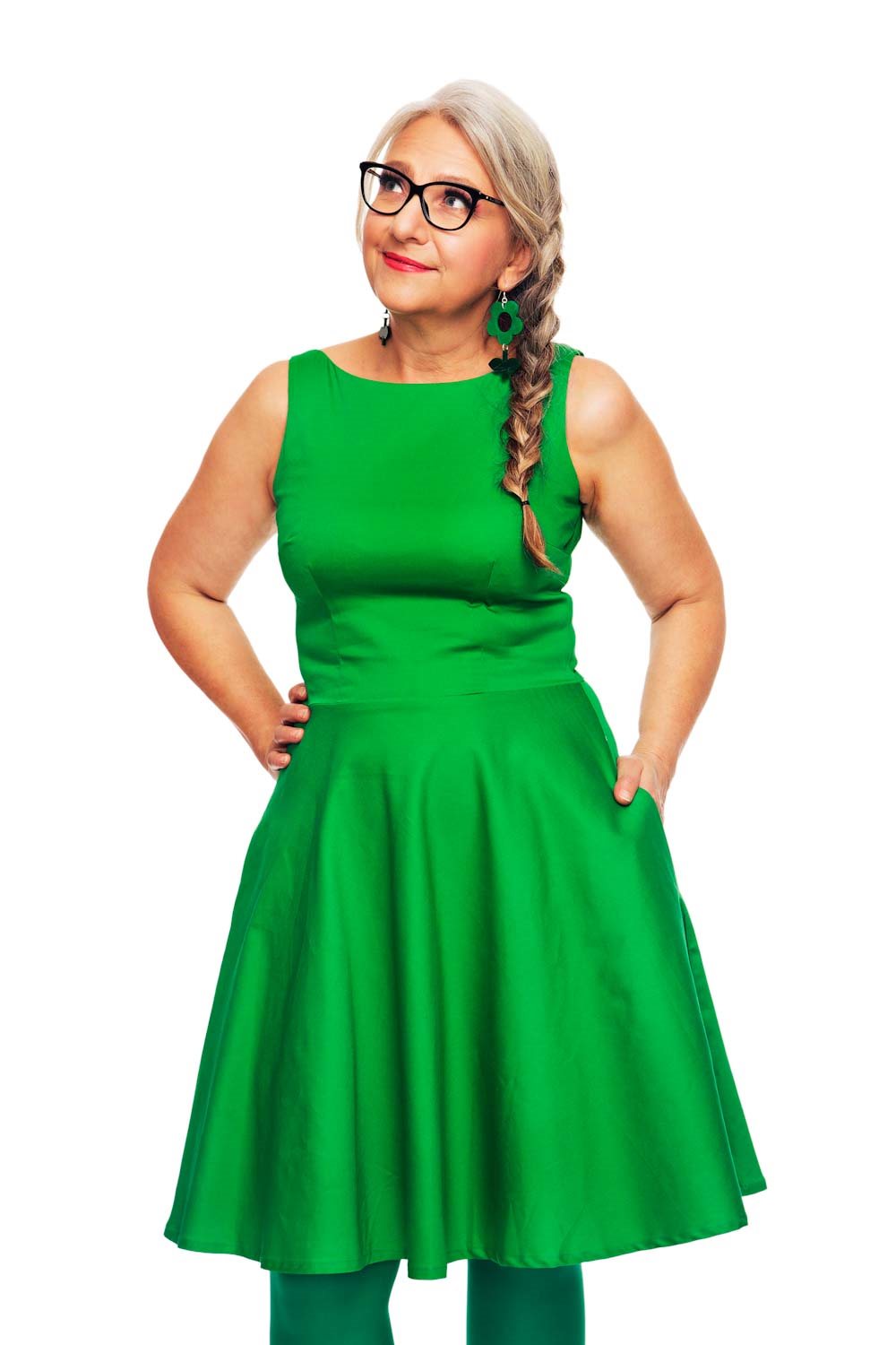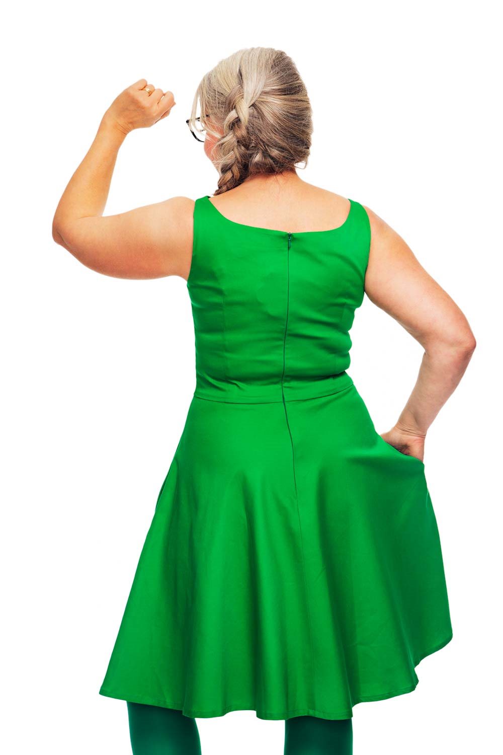 Saga är en klassisk 50-tals modell med vidd i kjolen. Klänningen är ärmlös, har båtringning, dolda fickor i sidan samt en osynlig dragkedja mitt bak. Kjolen är fodrad för att få ett läckert fall och för att inte haka upp sig på dina strumpbyxor.