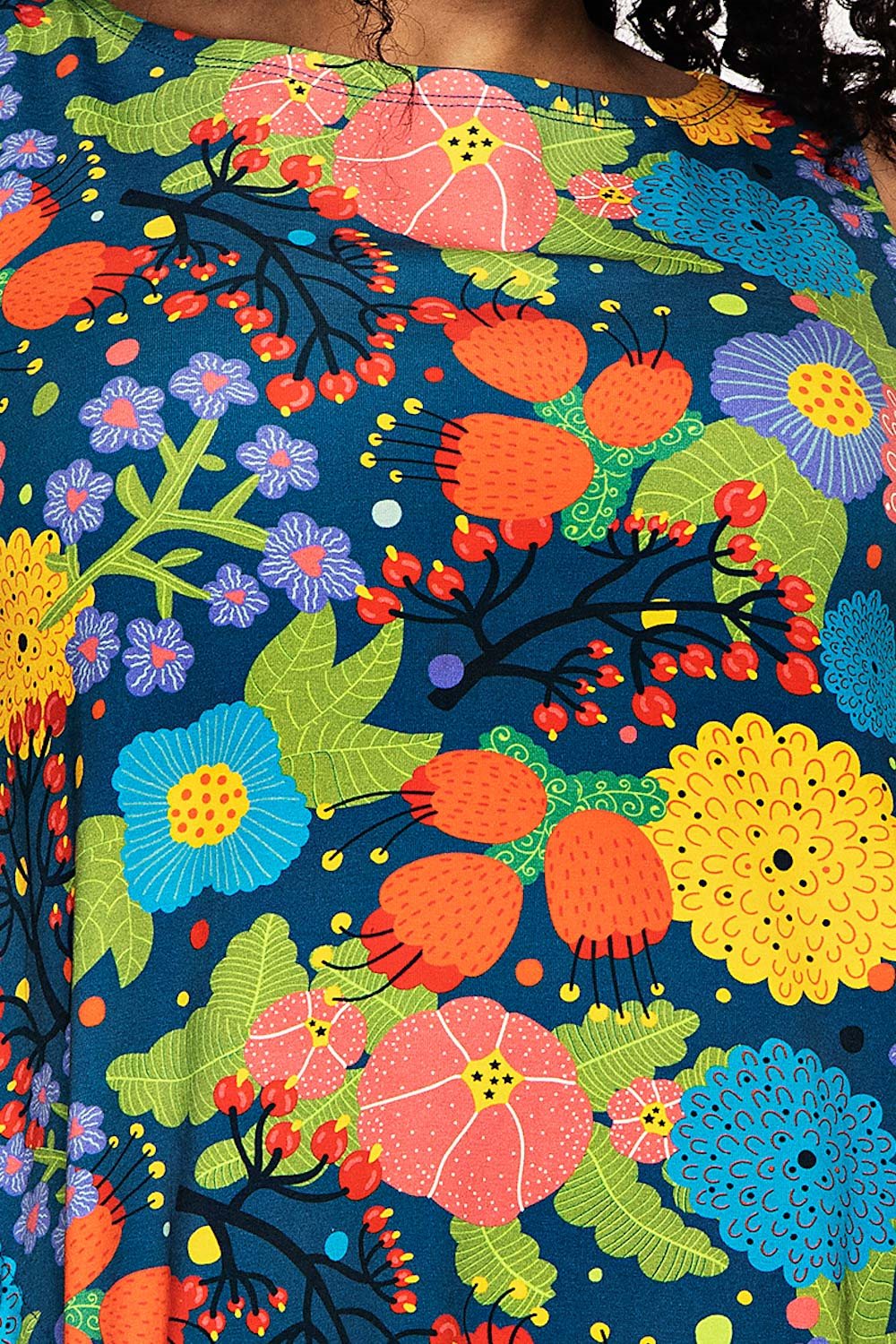 Lill är en ärmlös trikåklänning i ekologisk bomull med fickor i sidan. Den har rund halsringning och en utställd kjol med mycket vidd.
