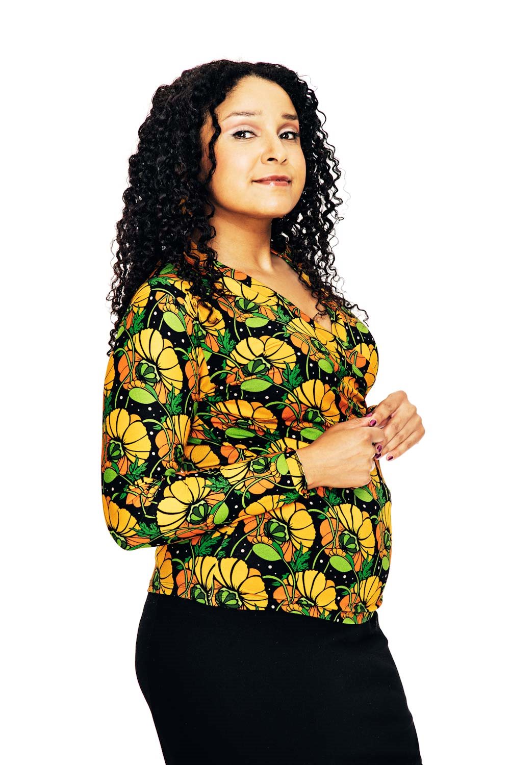 Vår topp Susanne i mjuk viskostrikå har en smickrande passform och är enkel att styla. Modellen är v-ringad med omlott-effekt och lång ärm.