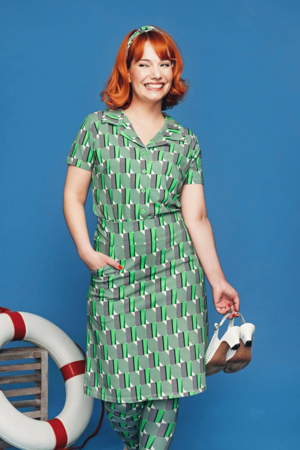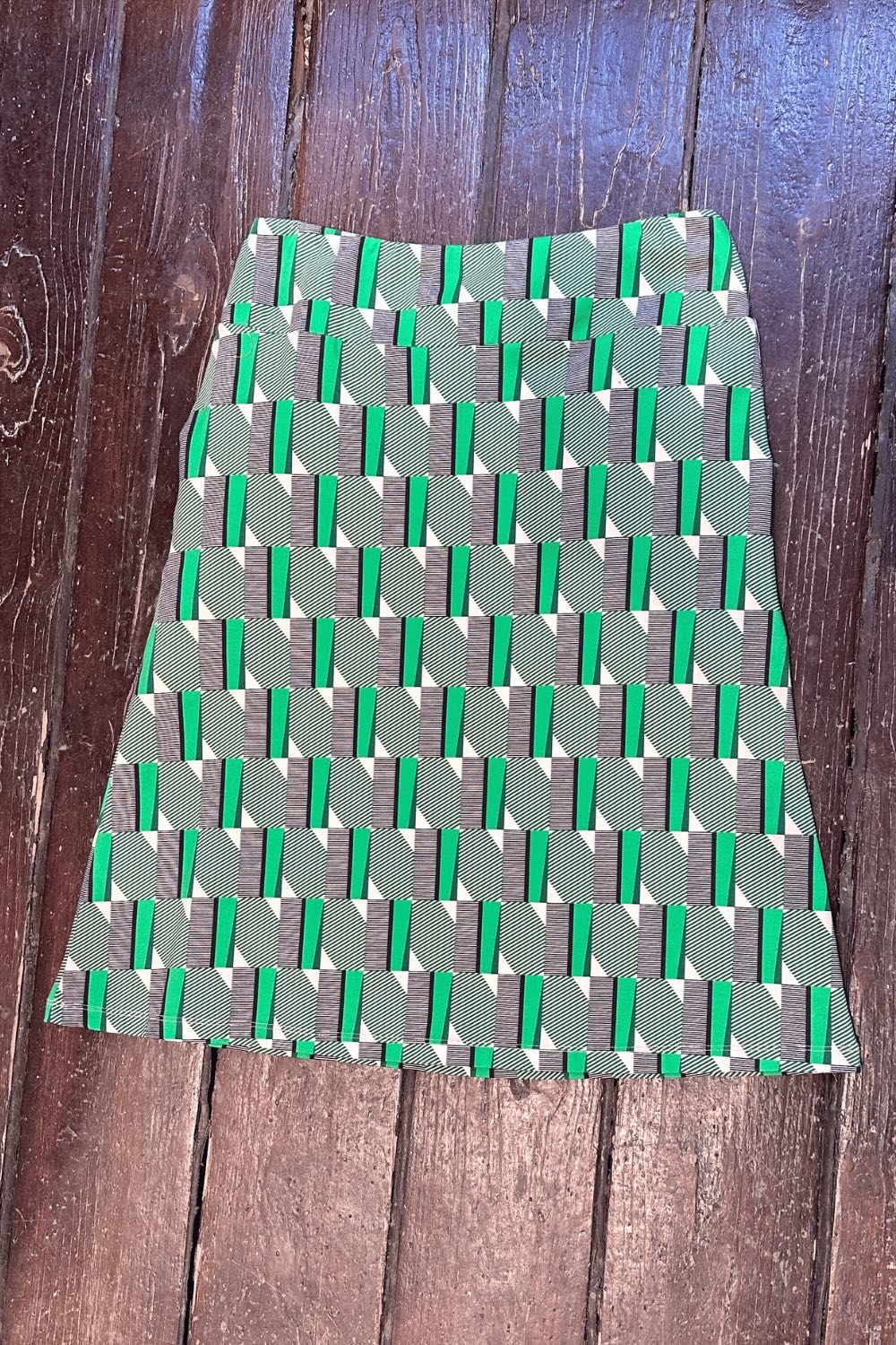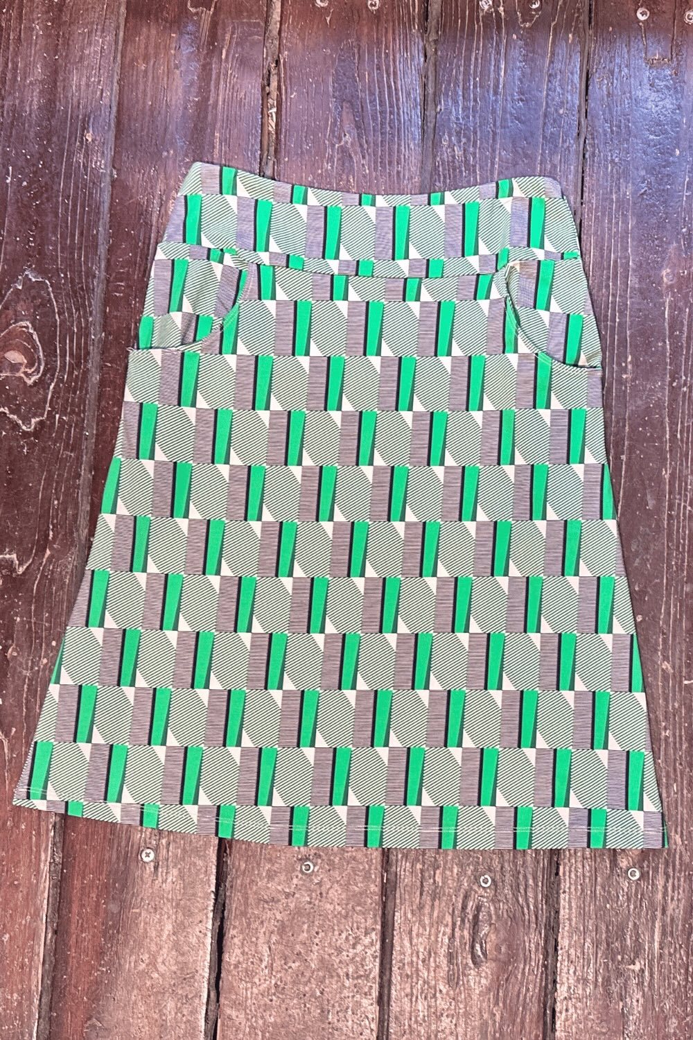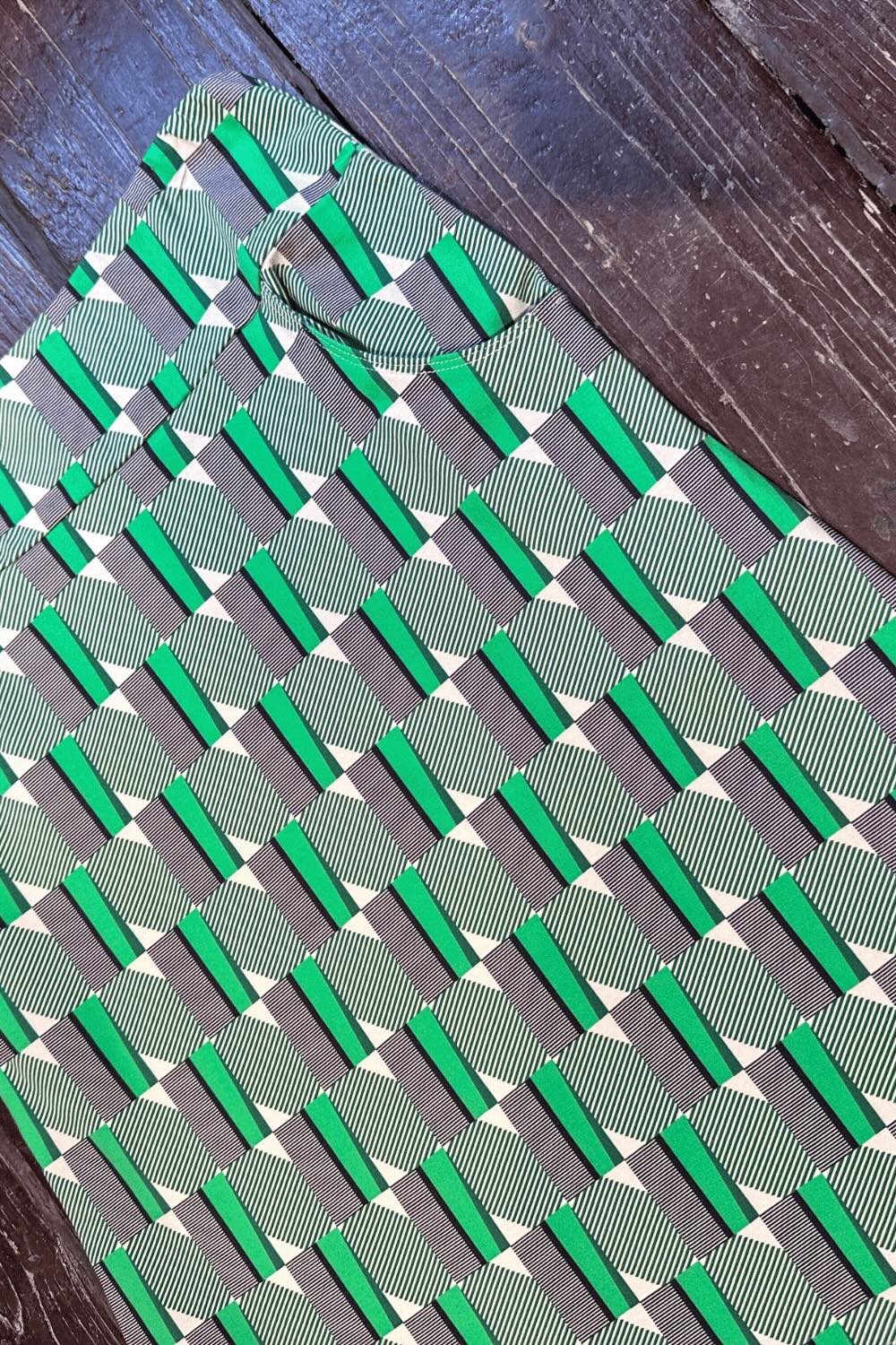 Tyget heter Brygga och för tankarna till 50-talets grafiska design. Mönstret är uppdelat i genomfärgade gröna rutor och svartrandig rutor. Genomgående i hela mönsterrapporten går det vertikala gröna ränder. Hela detta grafiska kalas på en creamvit botten. Färgerna går i grönt, svart och cream-vitt.