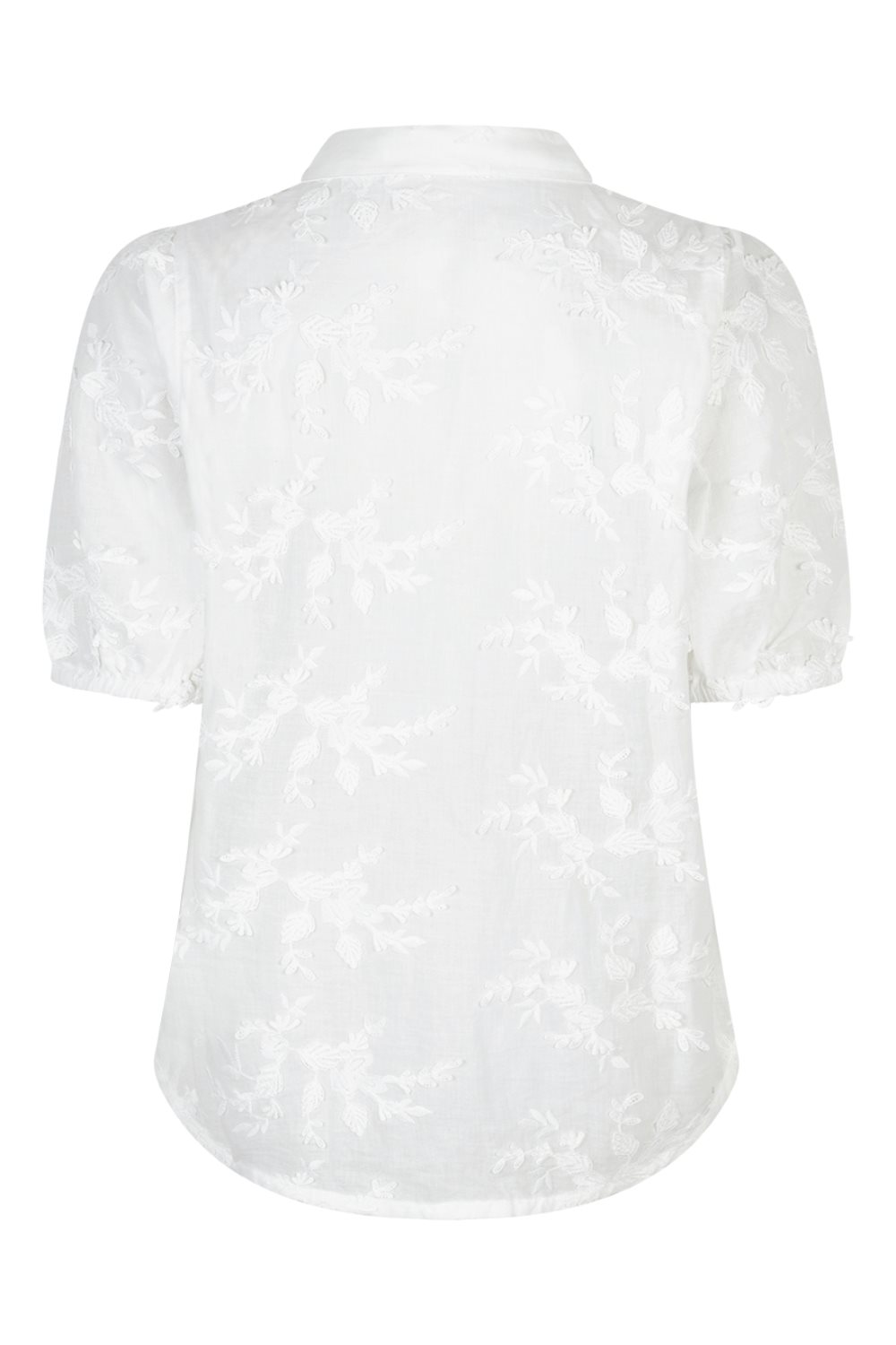 Vit blus i skir bomullspoplin med broderade blommor, vita knappar och korta puffärmar med en liten resår på slutet.
