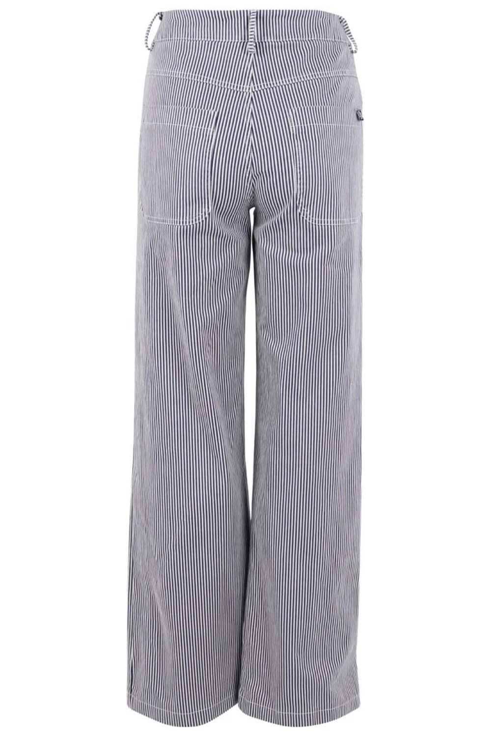 Raka byxori randigt canvastyg från danska märket Danefea. Modellen har hög midja och påsydda fickor framtill. En bekväm byxai randigt tyg i mörk marinblått och off-white. Byxorna har en rak passform med stora fickor fram. De har hög midja och stängs med dragkedja framtill. Byxorna är tillverkade av stretchig bomullscanvas, är bekväma att bära.