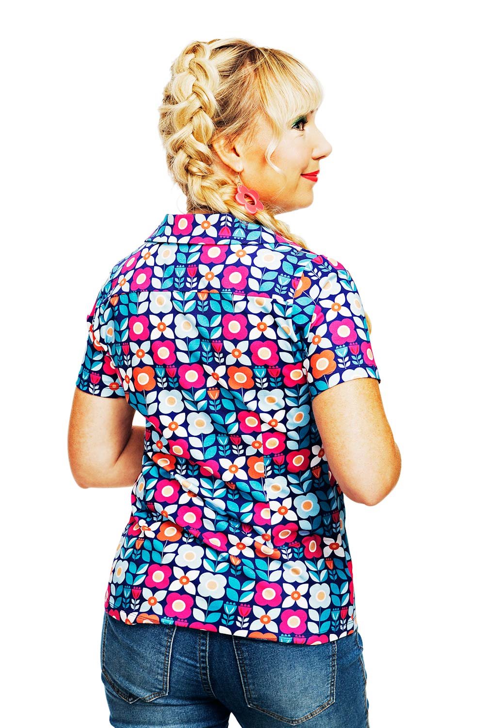 Margit är en figursydd kortärmad skjortblus i härlig bomullstrikå. Skjortan har knäppning fram och en fin krage med slag. Jättefin att bära utanpå eller instoppad i kjol eller byxa. Du kan även bära den uppknäppt över ett linne. Margit är syster till Matilda som har samma design fast långa ärmar.