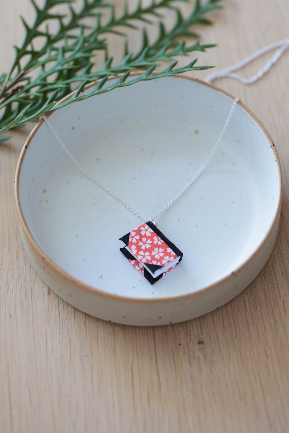 Boken mäter 2,5x2cm och är gjord i papper. Går att kombinera med örhängen i samma serie.