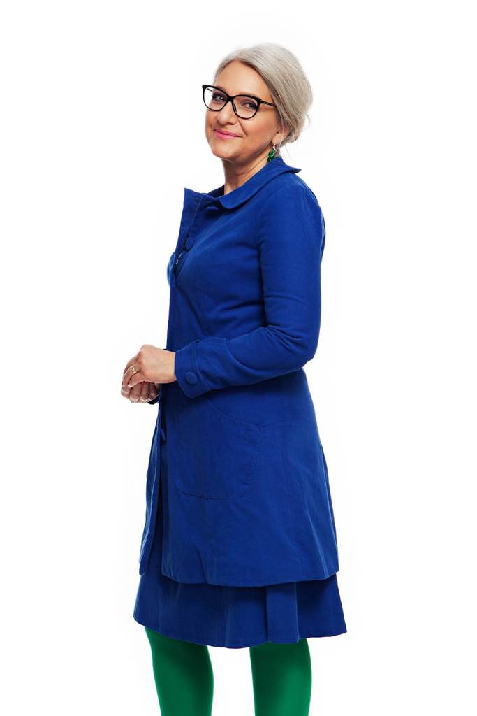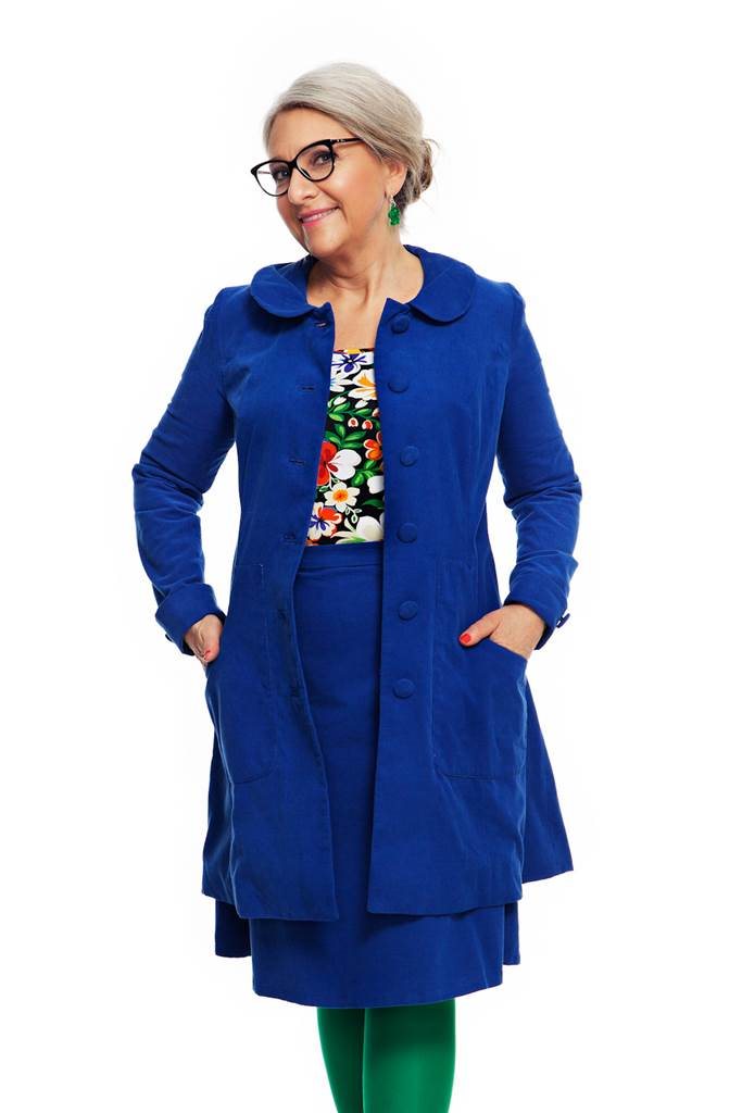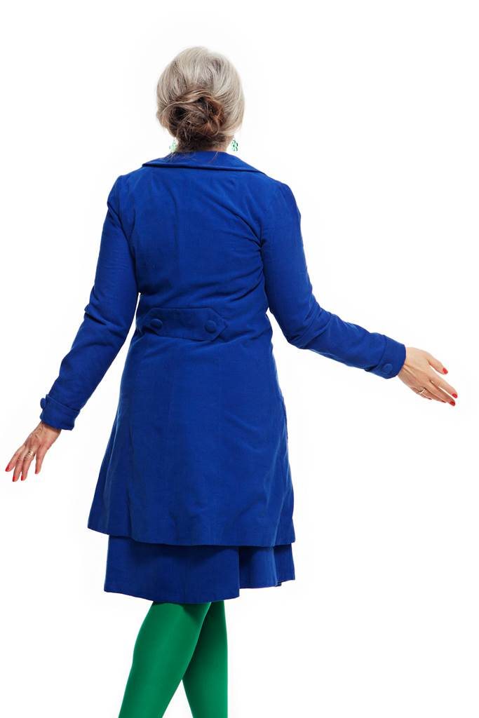 Kappan Berit är inspirerad av 60-talet. Den har en a-linjeformad design med en skräddad look. Berit har flera fina detaljer som klädda knappar och rundad krage samt fickor fram och manchettknapp vid ärmslutet.