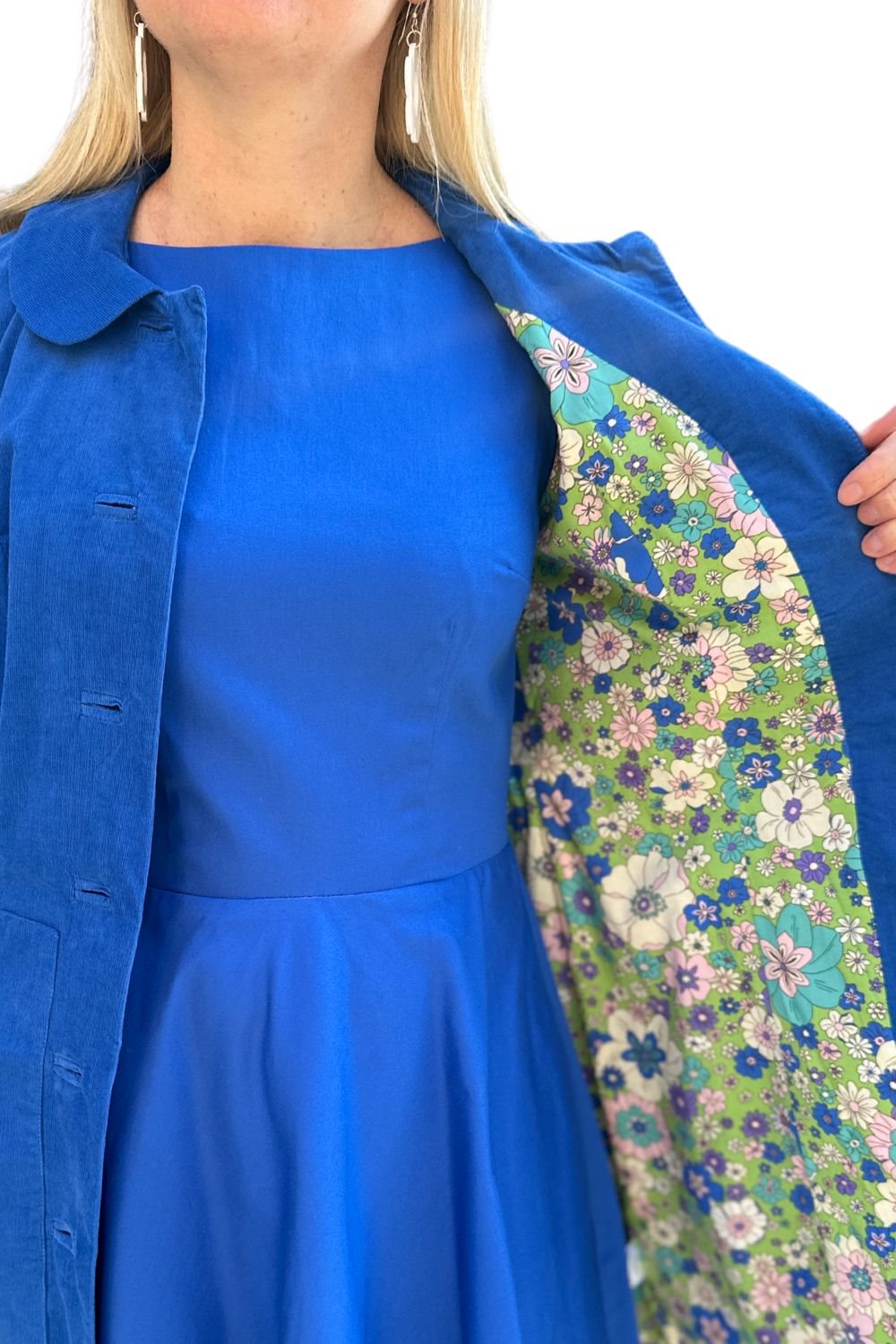 Material: 100% bomull, smalspårig manchester. Foder: 100% bomull och 100% acetat i ärmen.